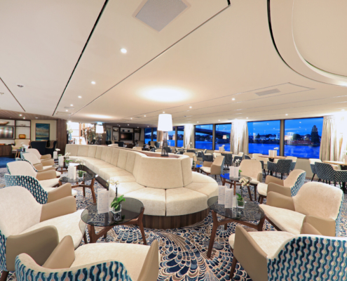 Elegante Räumlichkeiten auf 4 Passagierdecks verteilt. Stilvoll eingerichtete Panorama-Lounge mit Bar, Panorama-Restaurant ”Vier Jahreszeiten“, elegante Heckbar mit Außenterrasse, je nach Route auch mit à la carte-Restaurant. Atrium-Lobby mit Rezeption, kleine Boutique und Ausflugsbüro, Lift, Internet-Ecke, Sauna, Dampfbad, kleiner Fitnessbereich, Friseur, Wäscheservice, großflächiges Sonnendeck mit kleinem Pool, Liegestühle, Sitzgruppen, Schattenplätze und Sitzterrasse vorne sowie Barservice und kleine Aussichtsterrasse am Bug, WLAN (kostenpflichtig, je nach Fahrgebiet kann es ggf. zu Ausfällen/Störungen kommen).