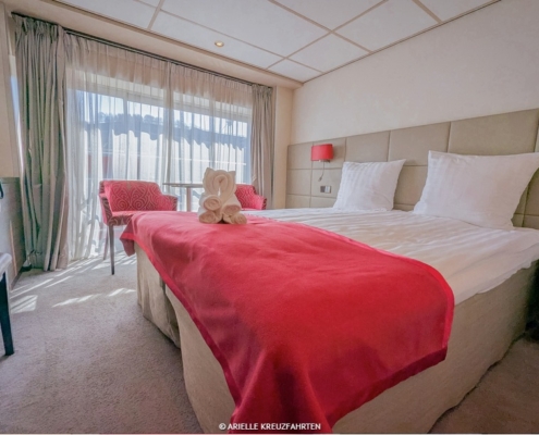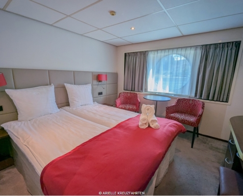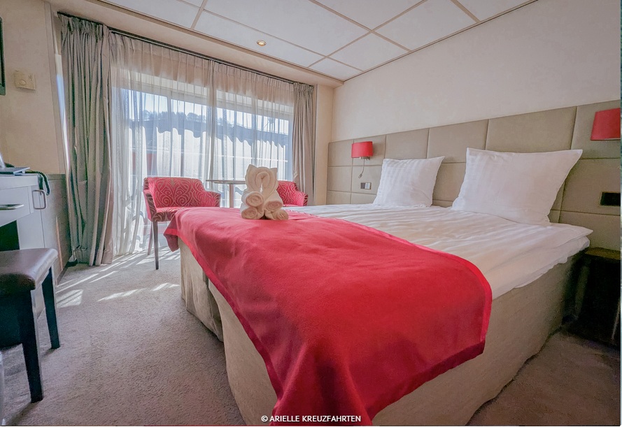 Den großen Kabinen, überwiegend mit franz. Balkon, fehlt es an nichts. Dusche/WC, Satelliten-TV mit Flatscreen, Radio, Telefon, Safe, Haartrockner, WLAN (gegen Gebühr), Nespresso-Kaffeemaschine sowie eine individuell regulierbare Klimaanlage.